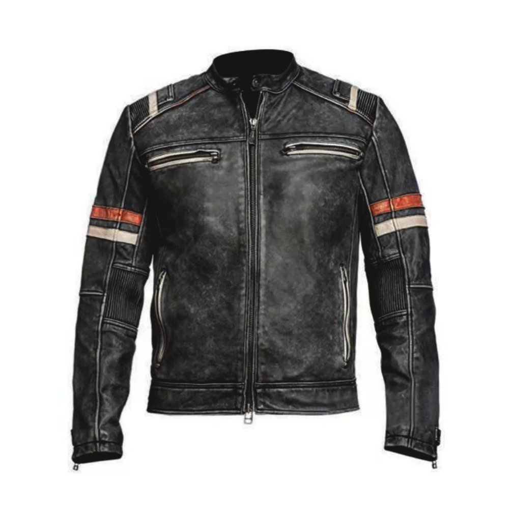Outer Shell Material Leather Pattern Solid Neckline Collared Closure Zip Occasion Casual Size All Sizes Available Garment Care Dry-Clean Only Lining Material Polyester Material Leather Accents Zipper Colour Distressed Black Vintage Yes Fit Slim Department Men Type Jacket Fastening Zip Length Waist Length Style Biker Theme Motorcycle Features Collared, Lined, Zipped Pockets Season Spring, Winter