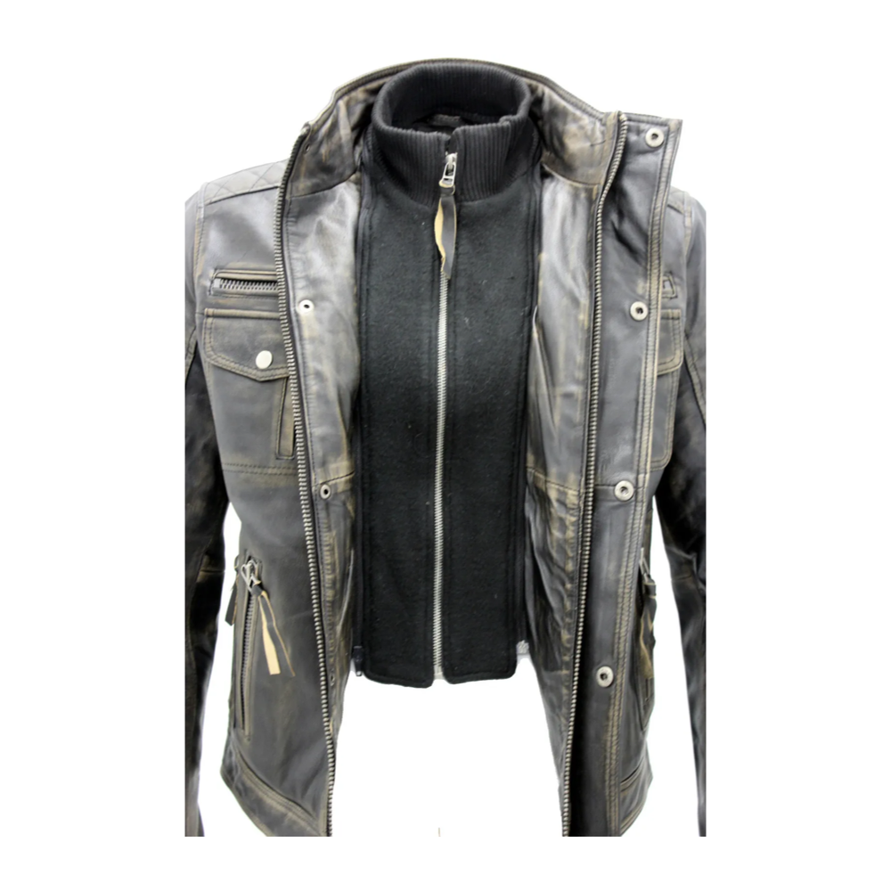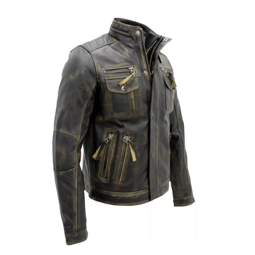 Features 100% Real Leather: Sheep Skin, Inner Material: Quilted Viscose Lining, Zipper Closure, Mandarin Collar, Long Sleeve, Pockets: Two Besom Inside, Five, Zippered & Two Flap Outside, Distressed Finish, Theme: Café Racer Jacket, mens summer jacket,male summer jacket,jacket men summer, jacket summer men,summer bike jacket,summer biker jacket, summer moto jacket,lightweight jacket,mens light jacket, men’s light jacket,light black jacket,light brown jacket, light weight jacket,summer jackets,summertime jacket, light summer jacket,summer jacket,jacket in summer, light bomber jacket,summer bomber jacket,black jacket light Season ALL